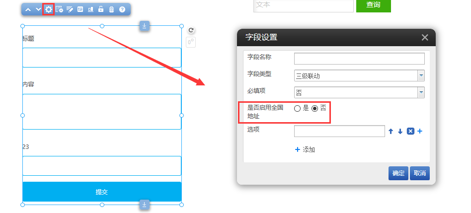 在建站前台拖出“留言”-“留言表单”插件,点击字段设置,字段类型选择三级联动,新增了是否启用全国地址设置项,选择是则会自动读取地区信息。如图所示: